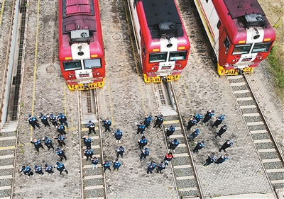 八月十九日,在肯尼亚内罗毕非洲之星铁路运营有限责任公司机务运转整备场,中肯两国铁路工作者在机车前站列并组成“3000”字样,以纪念蒙内铁路实现安全运营三千天。新华社记者 杨光 摄